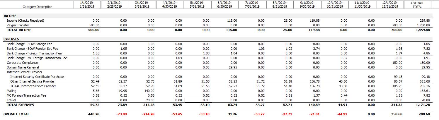 We started 2019 with US$16,667.69 in the bank. For the first three quarters of the year, our average quartely balance was US$16,790.78. Our year-end bank balance was US$16,956.19.