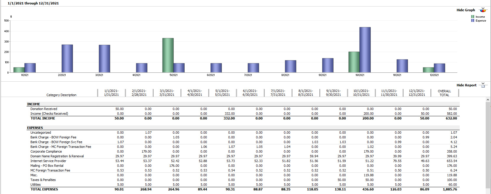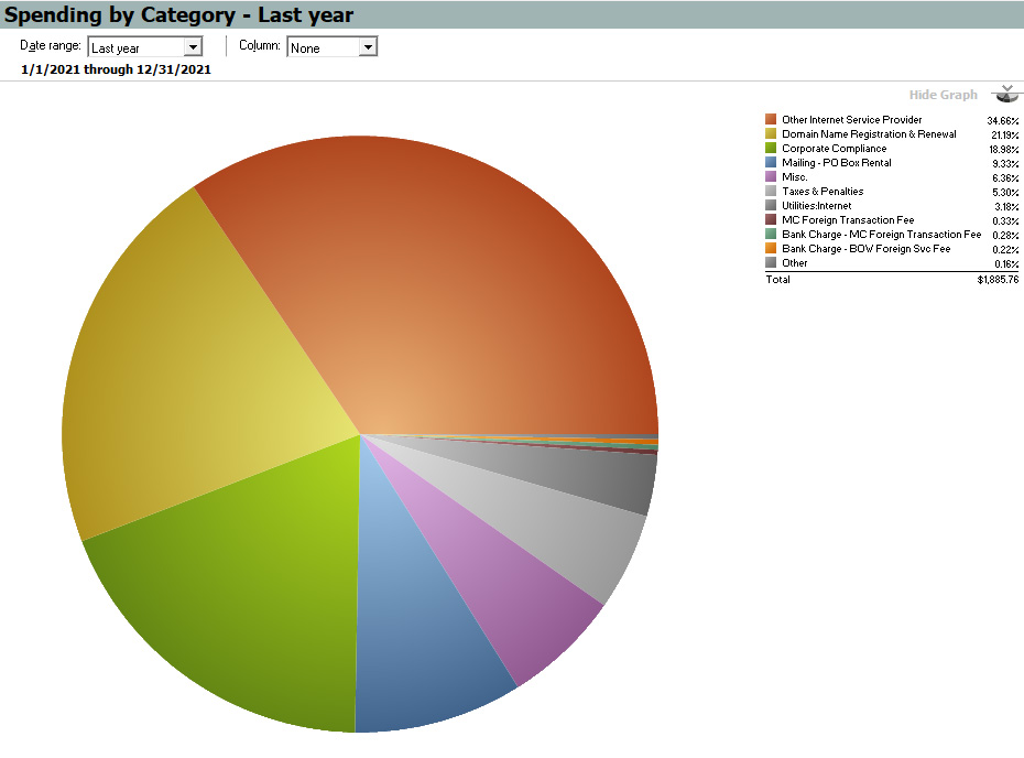 The next largest expense areas were the US$358 (19% of spending) spent on corporate compliance, and the US$176.00 for Post Office box rental (9.33% of spending).