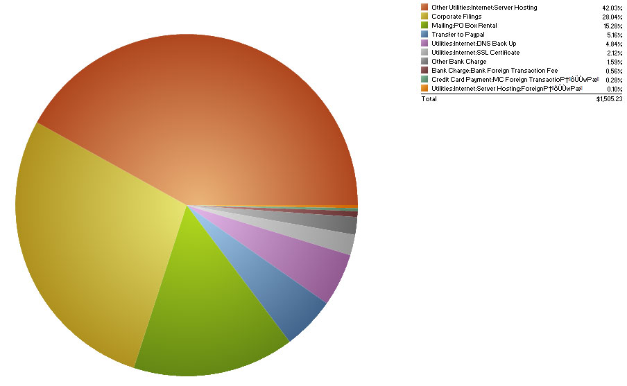 The next largest expense areas were the Post Office box rental (15.28% of spending) and corporate filings and compliance paperwork (28% of spending).