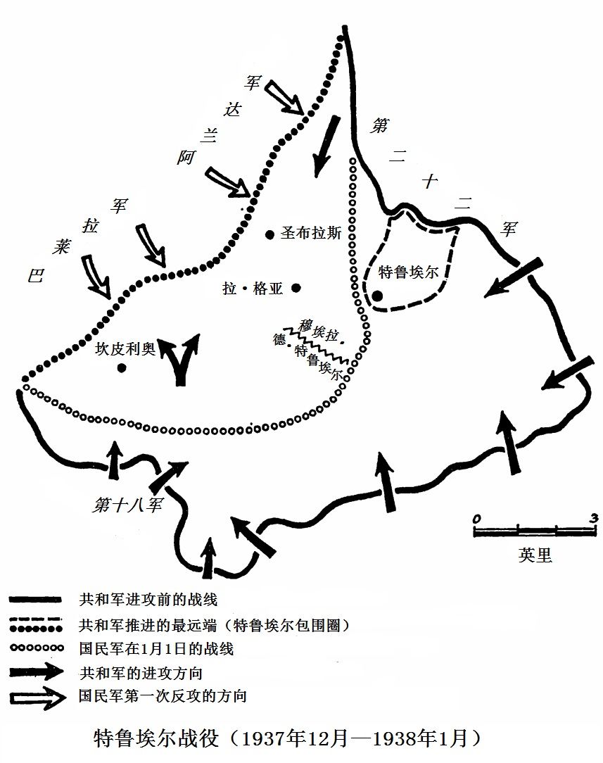 十二月十五日,共和军发动了进攻。在十五日至二十二日这一周里,进攻取得了较大的进展。包围计划在一开始进展顺利。共和军经过激战,攻占了坎皮利奥(Campillo)和圣·布拉斯(San Blas)。尽管如此,在共和军战线后面,仍有不少被包围的叛军在负隅顽抗,不得不一一消灭他们。十二月十八日,特鲁埃尔西南边的制高点穆埃拉·德·特鲁埃尔(Muela de Teruel)也被共和军攻占了。当地的守军且战且退,撤入了特鲁埃尔;十二月二十二日,共和军的两个师已经攻入了特鲁埃尔城内。驻防当地的国民军在雷·达库尔[7]上校的指挥下,在省政府大楼、西班牙银行、神学院和圣·克拉拉修道院与圣特蕾萨修道院里死守。于是形成了两条战线:在穆雷顿(Muletón)—圣·布拉斯—鲁维亚雷斯(Rubiales)以西,形成了外部战线,它大体上是连贯的;在特鲁埃尔城内,形成了内部战线,几千名叛军在这里死守。由于共和军缺乏兵力,无法同时做到占领特鲁埃尔和继续向纵深进攻,于是,在十二月二十三日至二十八日这段时间里,战线暂时平静下来。