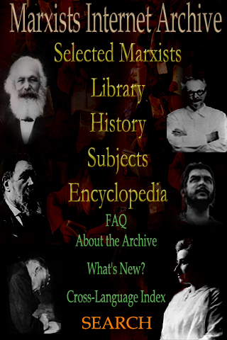 Selected Marxists Writers' Library History Archives Index Subject Archives Index Encyclopedia Frequently Asked Questions About the MIA What's New at MIA? MIA in Other Languages Search the Archives Trotsky Internet Archive Che Guevara Internet Archive Rosa Luxemburg Internet Archive Lenin Internet Archive Marx/Engels Internet Archive Marx/Engels Internet Archive