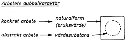 Det sista sammanfattande stycket är viktigt (41-42/61). Hur kan ett och samma arbete ha en dubbel karaktär? Hur är det möjligt att samma arbete är både konkret och abstrakt? Förhållandet mellan varans dubbelkaraktär och arbetets tecknar jag i följande sammanfattning av kap. 1:2. (Se punkt 18.)